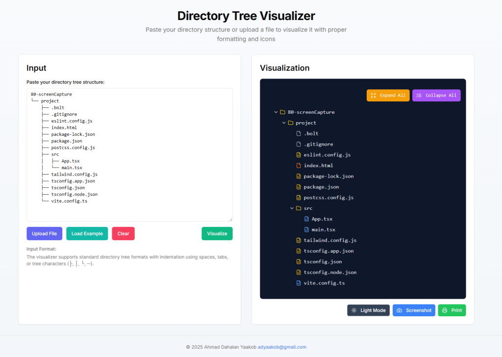 I built a directory tree visualization app using Next.js 13+, allowing users to input directory structures, interact with them, and capture screenshots.