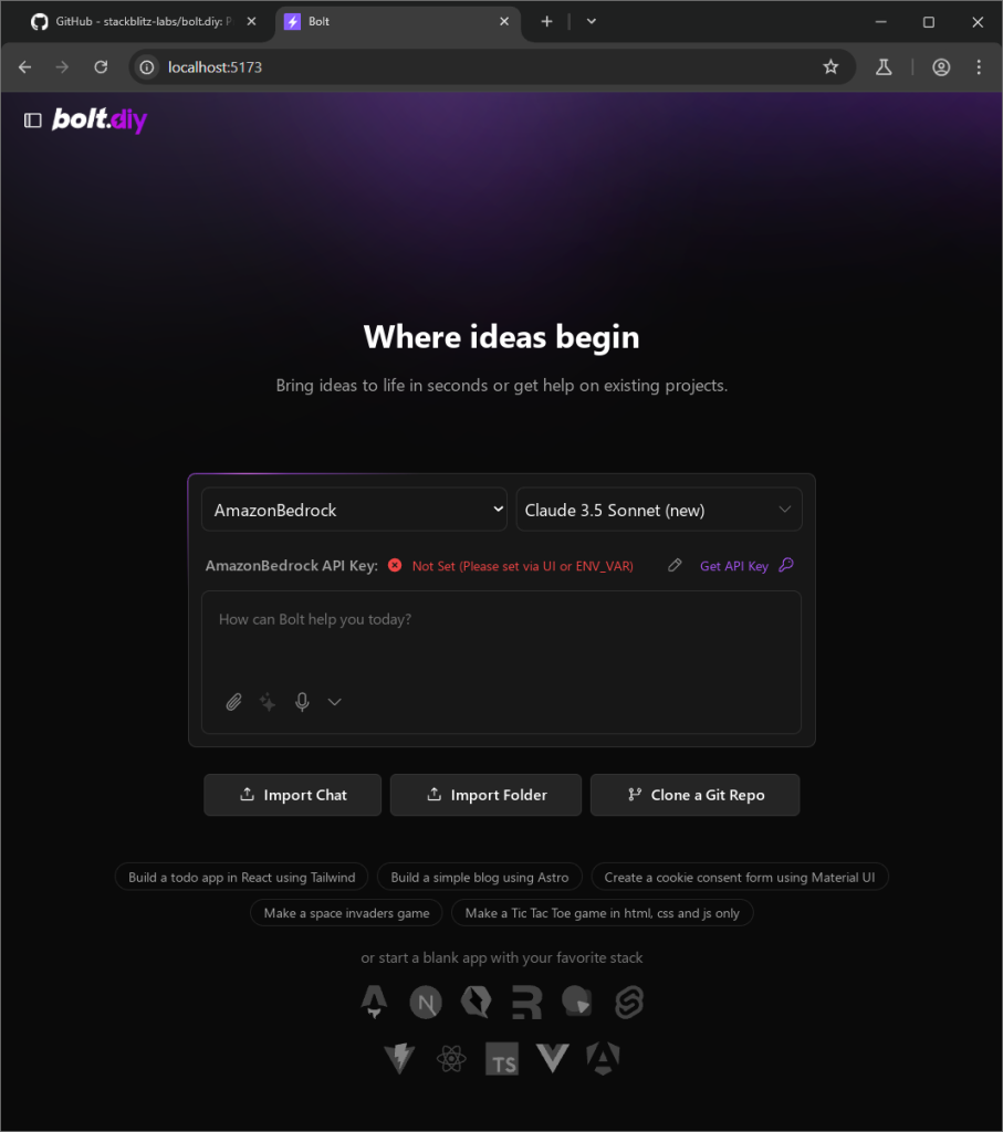 BOLT.DIY is a local version of the Bolt.new interface, and it’s open-source. You can run it on your own machine, and it feels similar to the original version without the usage limits.